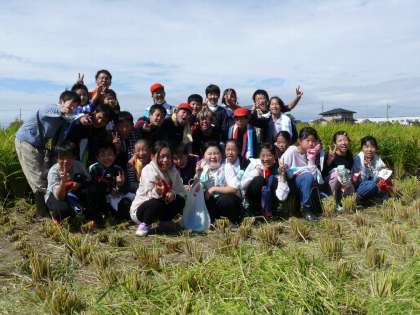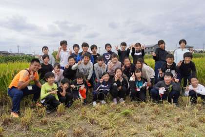 稲刈りに出かけた田んぼでの集合写真です。まずは5年1組,5年2組です。