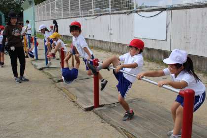 1年5組の体育の授業の様子です。鉄棒に挑戦中。足かけが上手にできていますね。