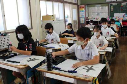 3年2組の書写の授業の様子です。毛筆で「木」の字を書いていました。上手に書けたかな?