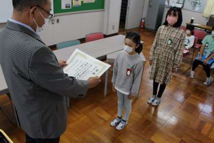 代表児童によるスピーチに続き、校長先生のお話を聞きました。校長先生のお話の後は、表彰を行いました。