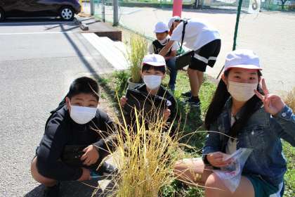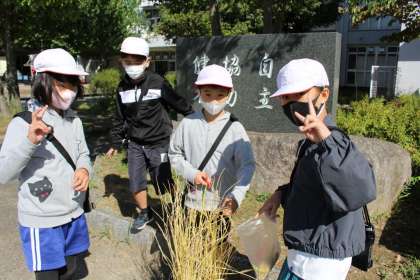 バケツ稲も稲穂をつけ、収穫の時期を迎えました。5年3組のみんなで収穫。お世話をしてきたかいがあって、お米を収穫することができました。