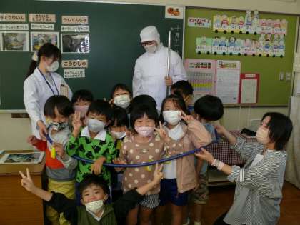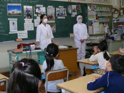 1年生は講師の先生をお招きして食に関する授業を行いました。みんなの給食を作るのにどれくらい大きな鍋を使っているのか、青い枠で示していただきました。こんなに大きな鍋で料理しているなんて、びっくりですね。