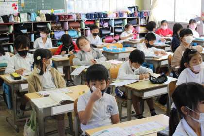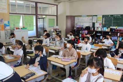 2年3組の国語の授業の様子です。人差し指を鉛筆に見立てて、漢字の筆順の練習中です。