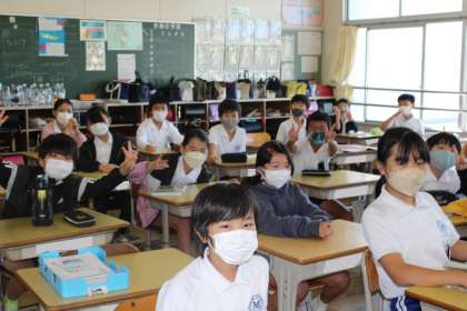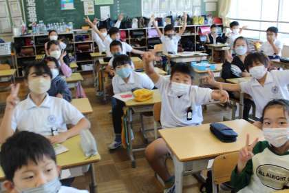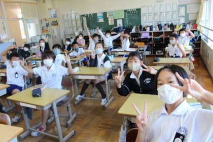 4年4組の放課の様子です。4年4組は元気いっぱいのクラス。多くのピースサインと笑顔があふれています。