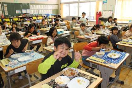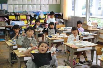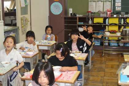 1年2組の給食の様子です。カメラに向かってピースサイン。おいしい給食に自然と笑顔がこぼれていますね。