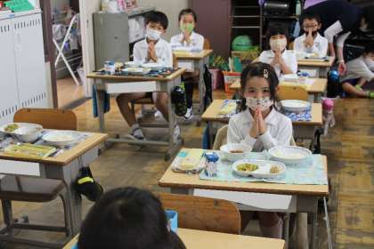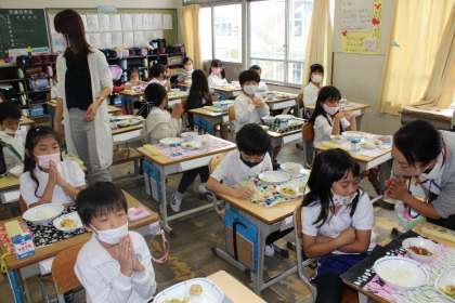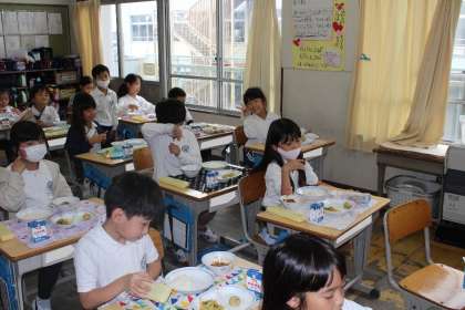 2年3組の給食の様子です。手をあわせて「いただきます」。今日もおいしい給食に感謝ですね!!