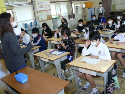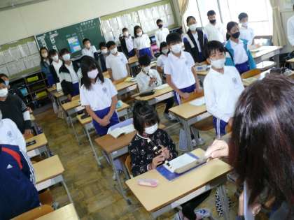5年3組は明日から始まる野外学習に向けて、「遠き山に日は落ちて」の練習中。リコーダーの伴奏に合わせてきれいなハーモニーを響かせていました。明日からの野外学習、楽しみですね!!