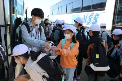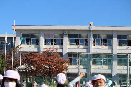 出発式も終わり、いよいよバスへ移動です。3階教室からは、6年生が「いってらっしゃい」のお見送り。若園小では、こうした心温まるお見送りの光景がいつも見られます。6年生のみんな、ありがとうね!!