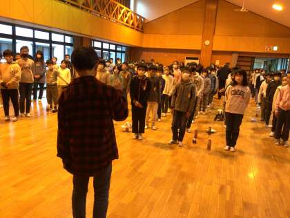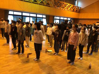 朝のつどいの様子です。早く集合して静かに待てる人が増え、成長を感じます。今日はクラフトと火おこしをしてマシュマロを焼いて食べる活動かあります。