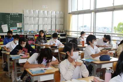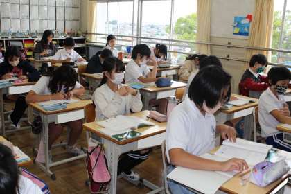 6年2組の算数の授業の様子です。方眼用紙を利用して拡大図、縮図をかいていました。上手に書くことができたかな?
