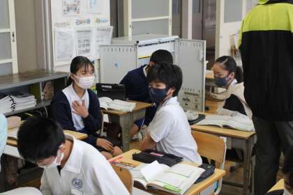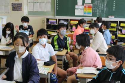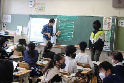 6年3組の英語の授業の様子です。ALTのグレッグと楽しく英語の学習中。ペア学習にも前向きに取り組むことができています。