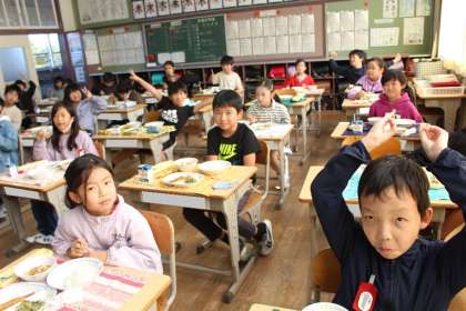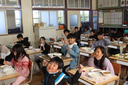 3年2組の給食の様子です。おいしい給食に自然と笑顔がこぼれています。
