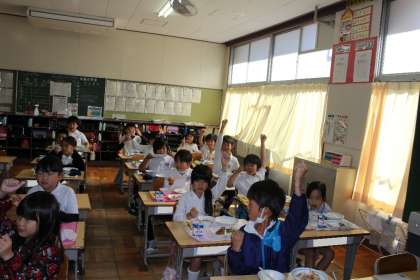 3年4組の給食の様子です。給食中に手を挙げているのは何のポーズなんでしょうか?みんなおいしそうに食べていました。