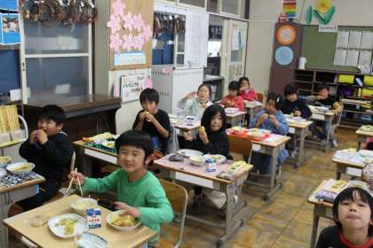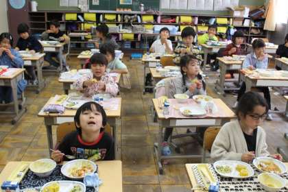 続いて1年2組の給食の様子です。おいしいカレーで、残さず食べることができました。