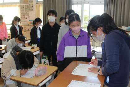 6年3組の算数の授業の様子です。算数の友の丸付けを先生にしてもらっていました。順番を待っている子も静かに待つことができていました。