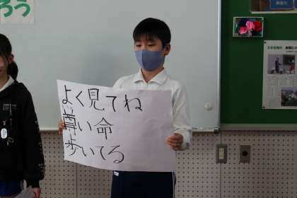 若園交通安全標語の表彰の様子の続きです。標語に込められた思いを全校児童に向けて発表しました。若園交通安全標語の優秀作品は今後ハザードファイルや交通安全啓発看板に掲載されます。お楽しみに!!