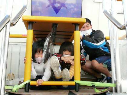 3,4年生は起震車に乗りました。起震車は震度6で揺れています。実際に乗ってみると予想以上の揺れに子どもたちは驚いていました。実際に大きな地震が来ても、落ち着いて机の下にもぐって命を守りましょうね。