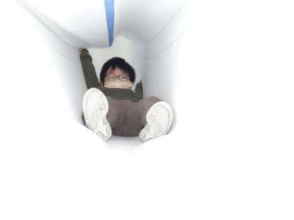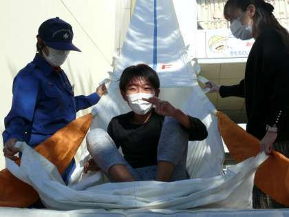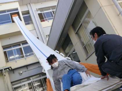 5,6年生は3階から救助袋で避難する体験です。勇気はいりますが、実際に滑ってみると思ったよりは怖くなかったようです。