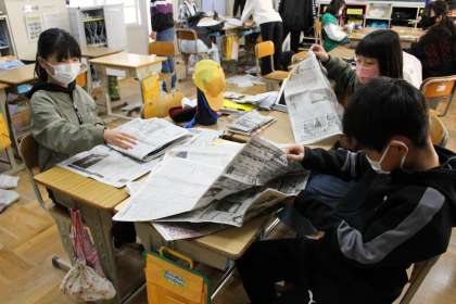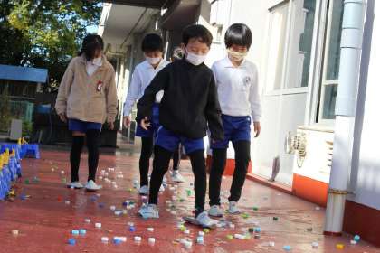 新聞紙を使って簡易スリッパを作成しました。身近にある新聞紙で、災害時に役に立つものを作成できるのはありがたいですね。ペットボトルキャップを割れたガラスに見立てて歩く練習もしました。子どもたちからは「新聞紙で作ったスリッパをはくと、全然痛くない」という声が聞こえてきました。