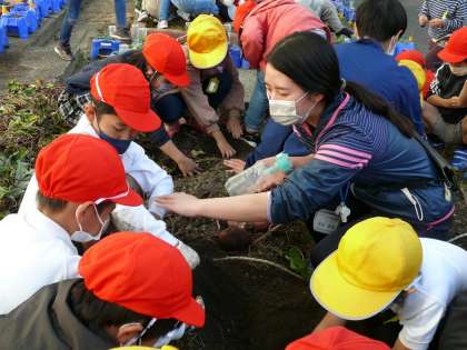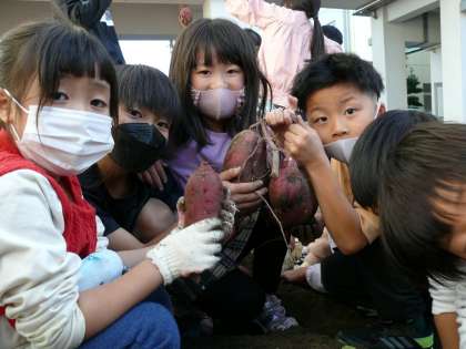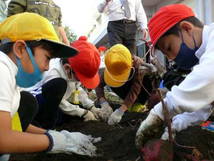 昨日1年生は生活科の学習で芋ほりを行いました。初夏に植えたサツマイモが立派に実りました。多くのサツマイモが収穫できて子どもたちも大満足です!!