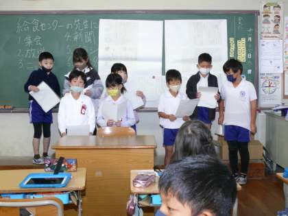本日3年生は栄養教諭の坂先生と片岡先生を講師としてお迎えして、給食センター出前授業を行いました。まずは3年1組の様子です。調べたことをニュース番組としてみんなに紹介していました。上手にプレゼンテーションができていました。