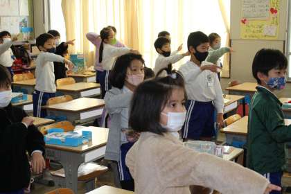 2年3組の授業の様子です。音楽に合わせてダンスをしていました。かわいく踊ることができていました。