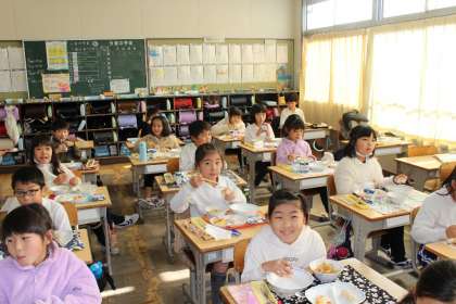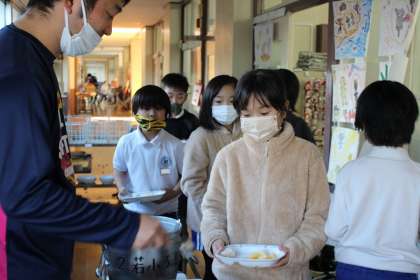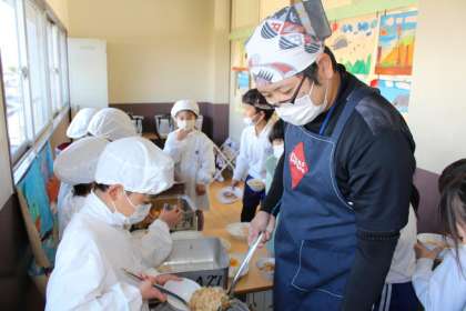 続いて2年3組,4組,3年4組の給食の様子です。担任の先生も一緒に配膳中です。