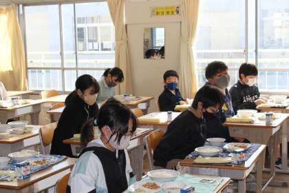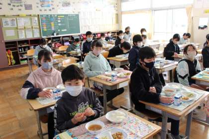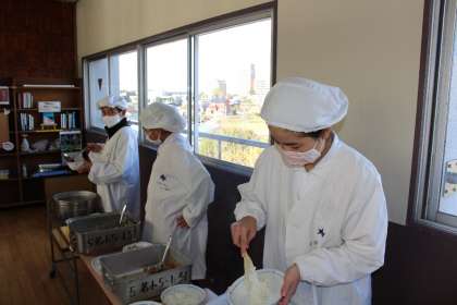 5年1組の給食の様子です。給食当番の子たちは髪の毛を帽子にしっかりと入れて取り組むことができています。