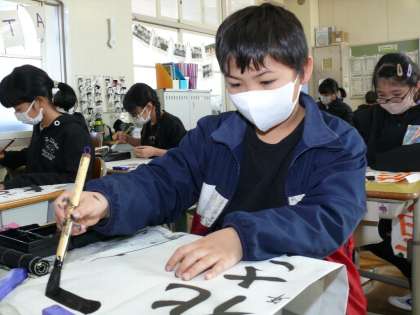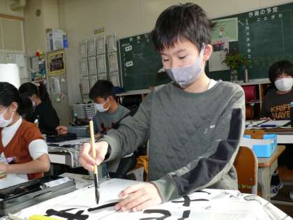 4年生の書き初め大会の様子です。「花さく里」の字を丁寧に書いています。背筋も伸びてとってもよい姿勢で書くことができていますね。