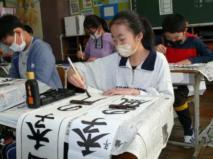 続いて5年生の書き初め大会の様子です。「四季の風」を集中して書いています。高学年らしく、落ち着いた雰囲気で取り組むことができていました。