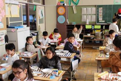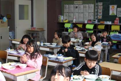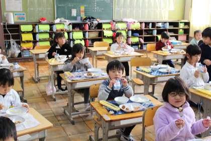 1年1組,2組,3組の給食の様子です。本日は鏡開き献立でした。おいしいぜんざいが出ました。お餅が柔らかくてとってもおいしかったですね!!