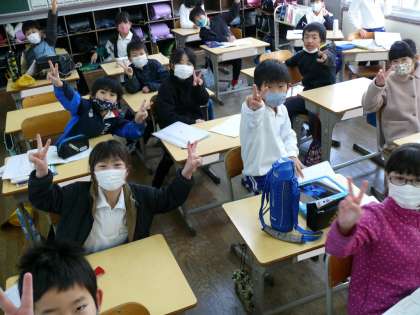 3年2組,3組,4組の朝の様子です。カメラに向かってピースサインが素敵ですね!!