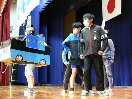 6年生を送る会 公開日 2023/02/24 更新日 2023/02/24 お知らせ 22日(水)と本日の2日間にわたって、6年生を送る会が行われました。今年は組団ごとに体育館に集まって、卒業する6年生を祝いました。今日は6年生を送る会の1組団の様子をお届けします。 6年生はステージの上からアーチをくぐって入場しました。入場後、5年生による思い出の劇を見て、楽しい時間を過ごしました。