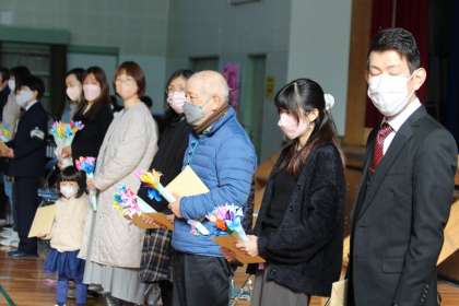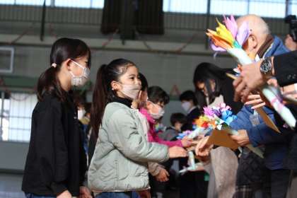 最後に3年生から、折り紙の花束をプレゼントしました。あわせて、全校児童が書いた感謝のお手紙を渡しました。