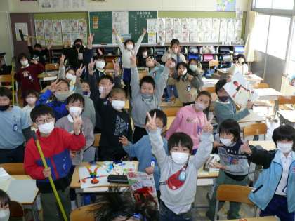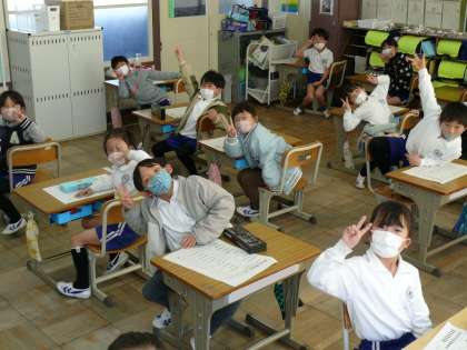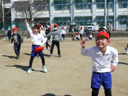 続いて1年4組,5組,2年1組の授業の様子です。1年5組は運動場で体育の授業。春のような陽気の中、子どもたちはとっても元気よく活動しています!!