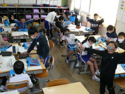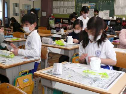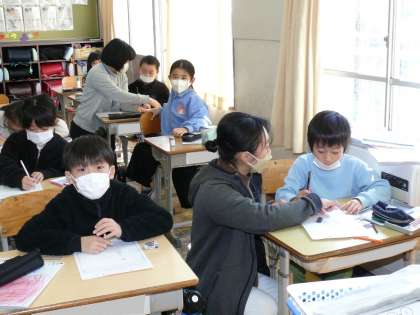 続いて2年3組,3年3組,4組の授業の様子です。3年4組は図工で作品を制作中です。1年の最後に、思い出に残る作品が完成するといいですね。