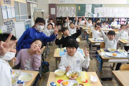 給食の様子をお届けします。まずは2年1組,2組,3組の様子です。2年1組はカメラを向けるとみんなピースサイン。明るい笑顔がとってもすてきですね。