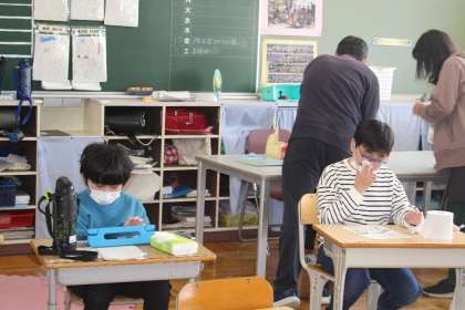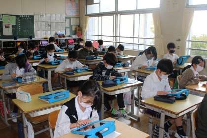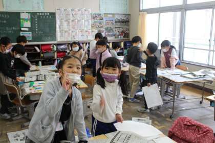 続いて2年2組,4年4組,フレンド学級の授業の様子です。2年2組は図工で版画を刷っていました。カラフルでかわいい作品ができあがりましたね!!