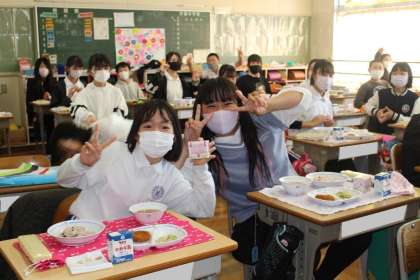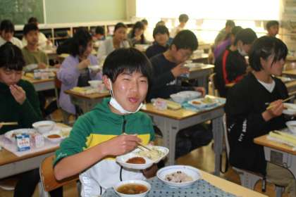 続いて6年3組,4組の給食の様子です。おいしいメニューに自然と笑顔がこぼれています。6年間、おいしい給食を作ってくださった給食センターの皆さんに感謝、ですね。