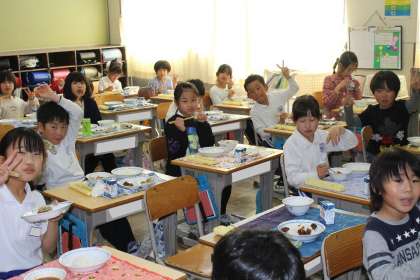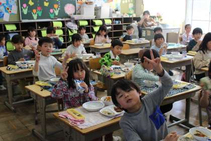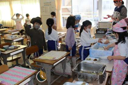 続いて1年4組,5組,2年1組の給食の様子です。1年4組では給食当番の子ががんばって配膳をしていました。いつもありがとうね。