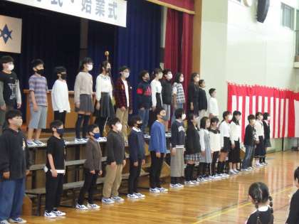 入学式では6年生が「歓迎のことば」を述べました。1年生のみんなも「あいさつ・おりがみ・なわとび」にがんばって取り組んでいきましょうね。校歌隊の32人の校歌が体育館に響き渡りました。とっても素敵な校歌斉唱でした。