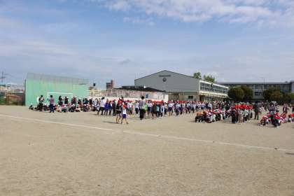 今日は1時間目に地震・火災を想定した避難訓練を行いました。全校児童が運動場に避難しました。先生たちがみんなの無事を確認して教頭先生に報告しました。