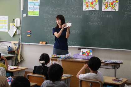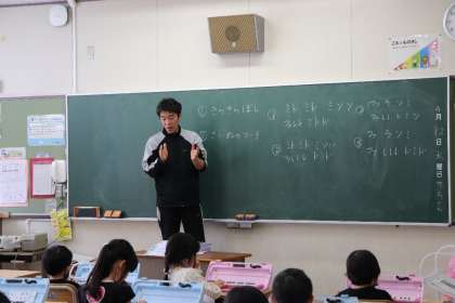 続いて1年5組,2年1組,2年2組の授業の様子です。2年1組は図工の授業中。ちょうちょの絵をカラフルに塗ってきれいな作品を作っていました。