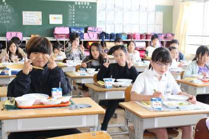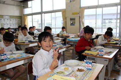 続いて4年3組,4年4組,5年1組の給食の様子です。4年4組は牛乳を手に「乾杯!!」。あたたかいクラスの雰囲気がとっても素敵ですね。