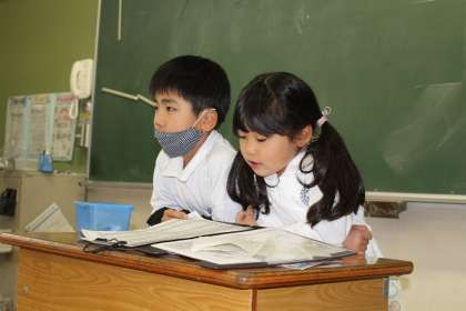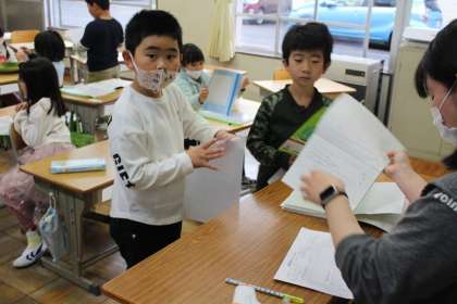 朝の様子です。まずは1年1組,1年2組,1年3組です。1年2組では係の子が上手に健康観察を進めていました。