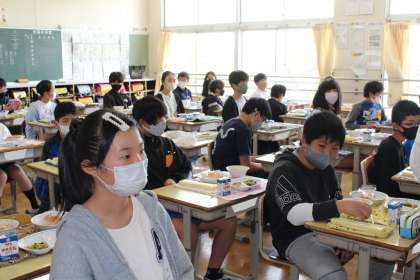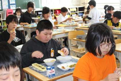 給食の様子 6年1組,6年2組,6年3組 公開日 2023/04/28 更新日 2023/04/28 お知らせ 続いて6年1組,6年2組,6年3組の給食の様子です。今日は米粉パンにビーフン、餃子と、子どもたちに大人気のメニューでした。