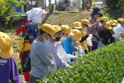 お茶摘みは初めてという子ばかりで、興味津々に話を聞き
