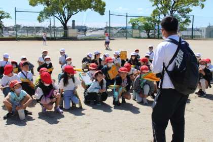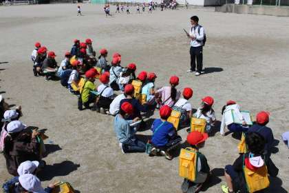 3年1組,3年4組が2,3時間目に社会科の学習の一環として校外学習に出かけました。運動場に集合して、事前の確認をしています。天気も良く、絶好の校外学習日和でしたね。