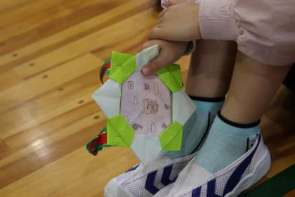 4年生からは、手づくりの花のメダルのプレゼントが渡されました。一つ一つにイラストが描かれていて、1年生は首にかけてもらって嬉しそうでした。