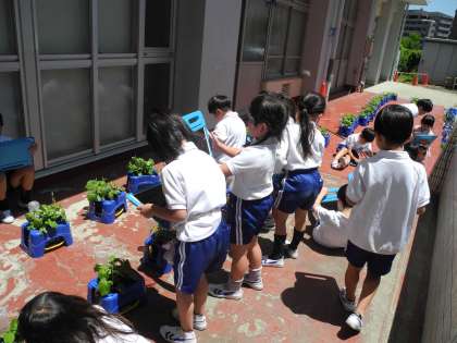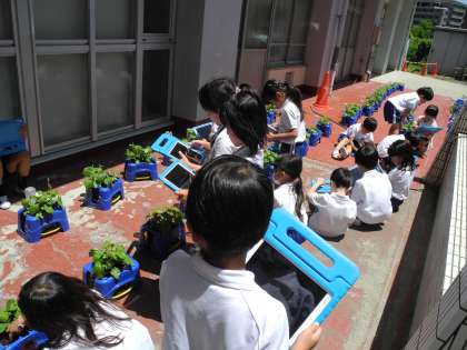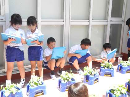 朝顔に肥料をあげました。タブレットで記録をしました。